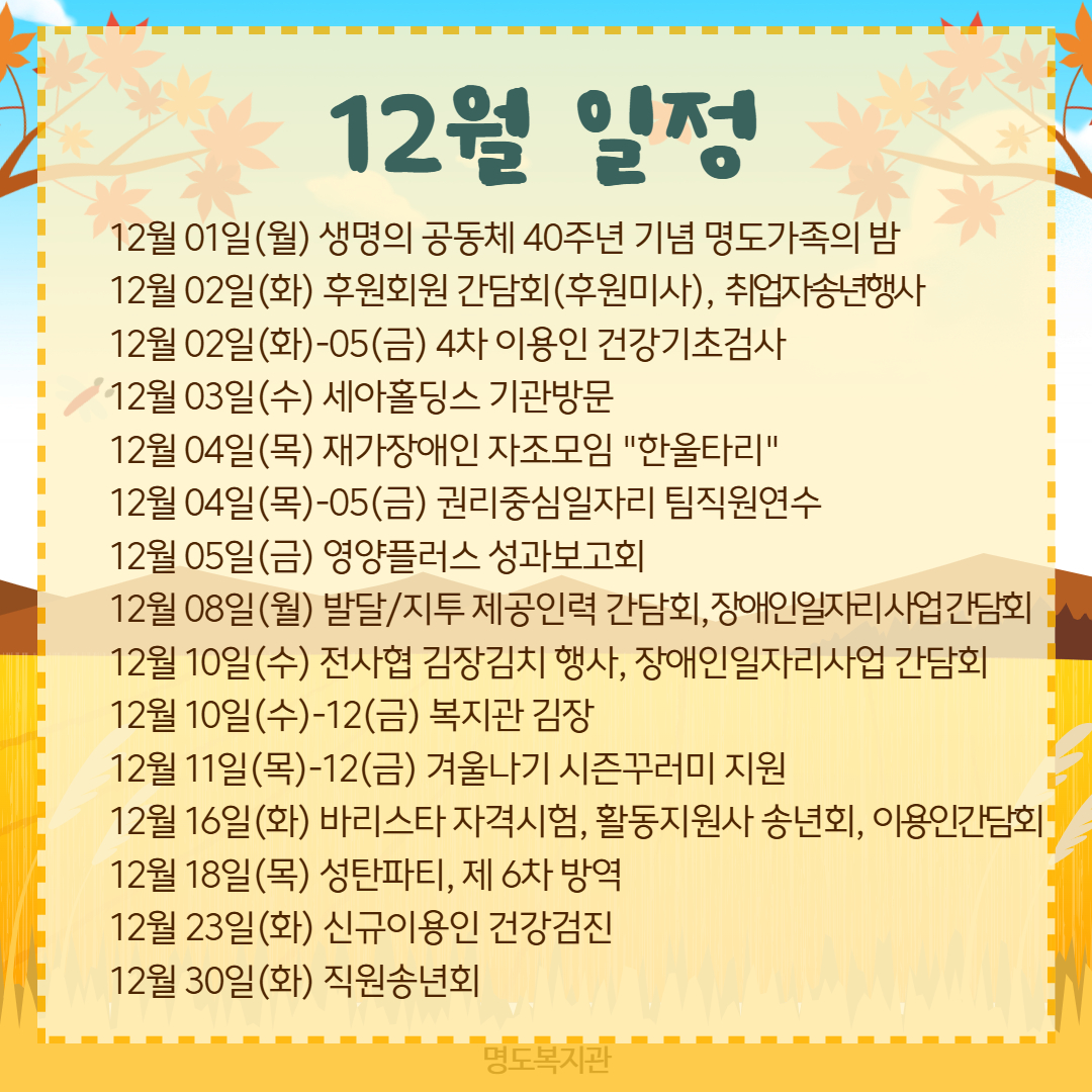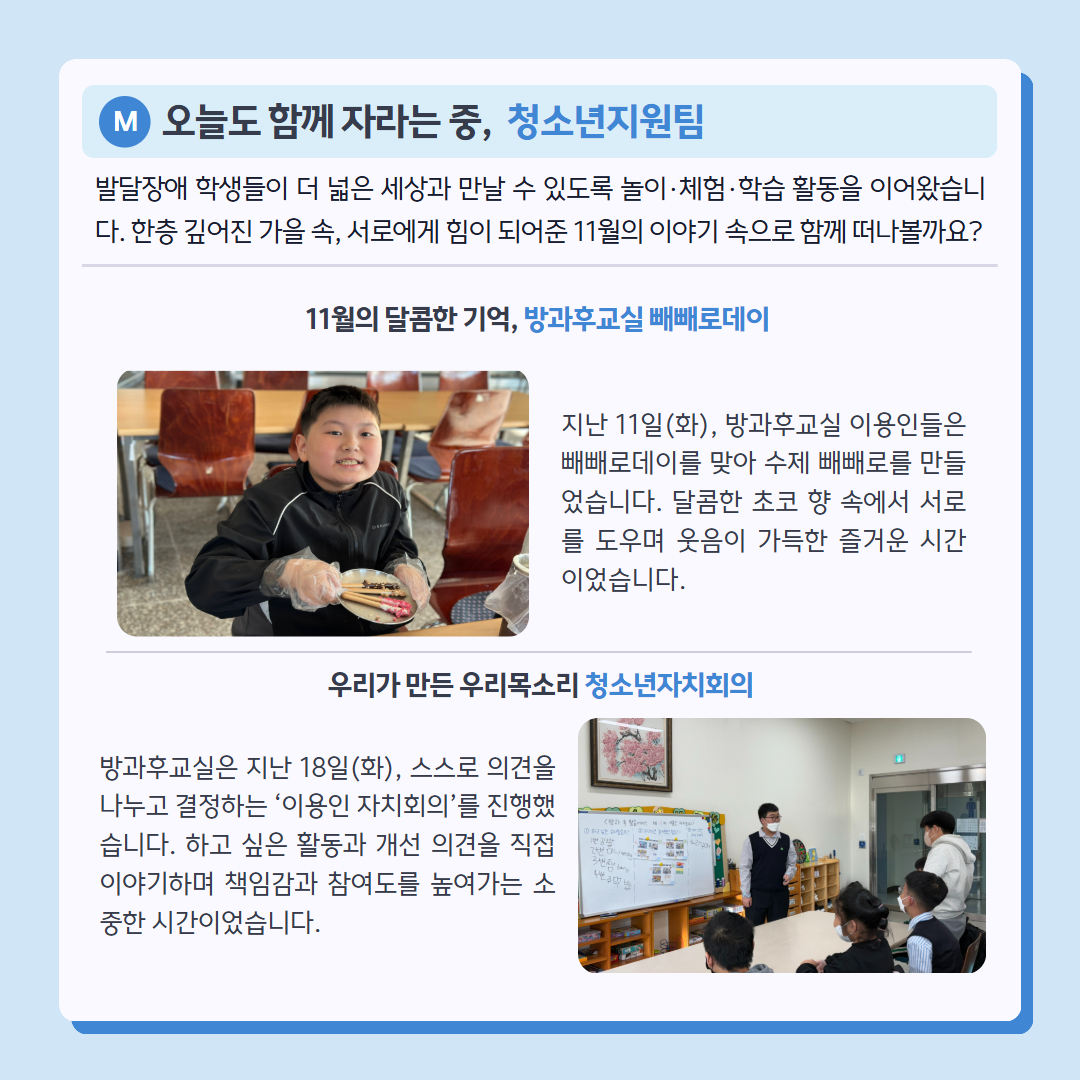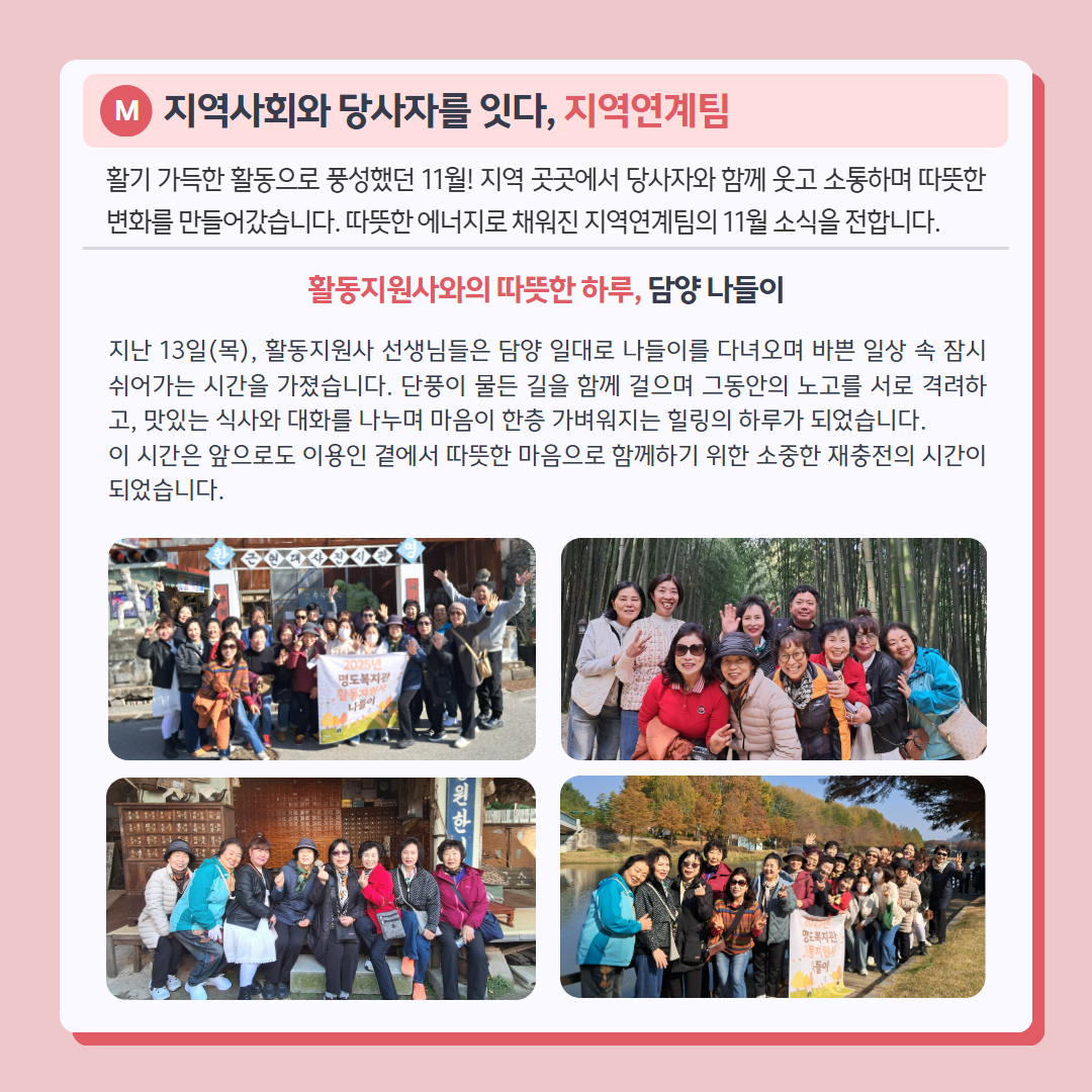 한층 차가운 바람 속에서도 햇살이 따뜻하게 머무는 11월, 한 해의 마지막을 준비하는 마음이 조용히 깊어지는 시기입니다. 일상 곳곳에서 느껴지는 작은 온기처럼, 여러분의 관심과 응원이 늘 큰 힘이 되어 서로에게 따뜻한 동행이 되고 있습니다. 함께해주신 마음에 진심으로 감사드리며, 문득 찾아오는 계절의 여유가 여러분의 하루에도 포근한 위로와 기쁨이 되길 바랍니다. 늘 건강하시고, 올 한 해의 끝자락까지 평안과 행복이 가득하시기를 바랍니다.