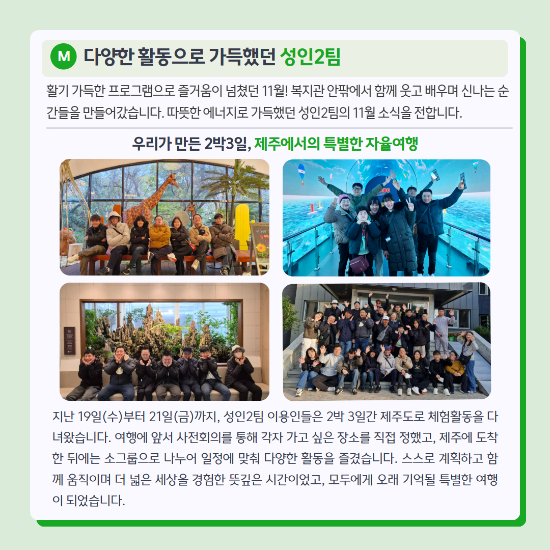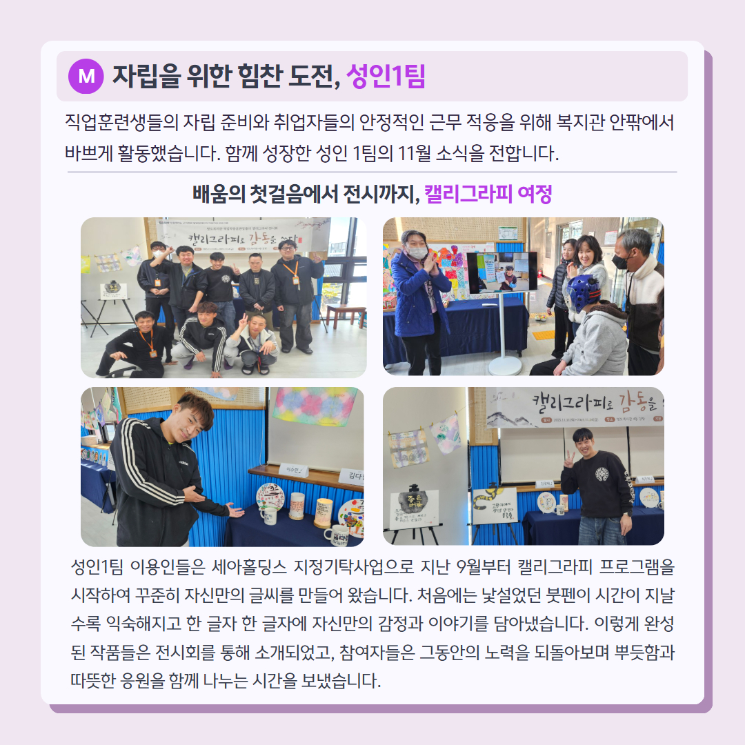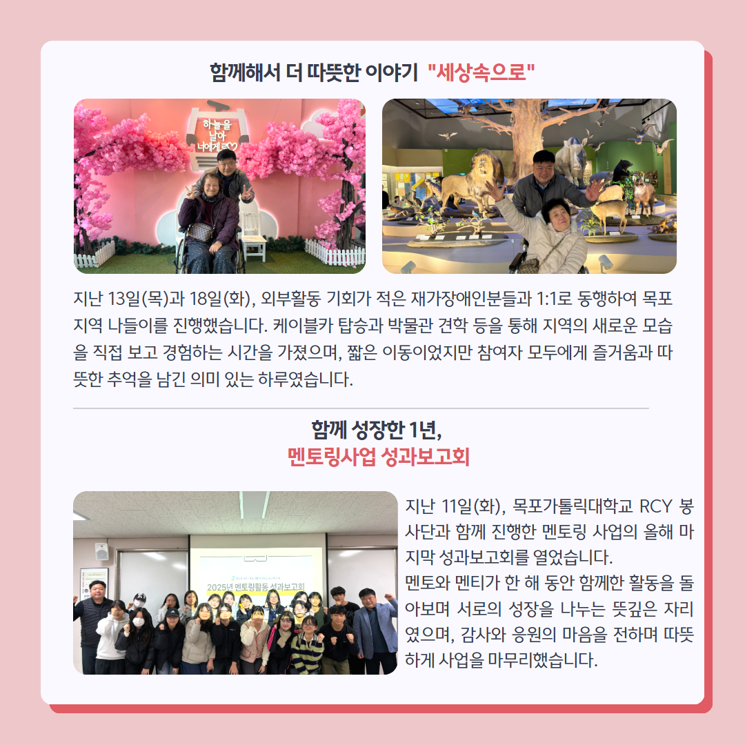 한층 차가운 바람 속에서도 햇살이 따뜻하게 머무는 11월, 한 해의 마지막을 준비하는 마음이 조용히 깊어지는 시기입니다. 일상 곳곳에서 느껴지는 작은 온기처럼, 여러분의 관심과 응원이 늘 큰 힘이 되어 서로에게 따뜻한 동행이 되고 있습니다. 함께해주신 마음에 진심으로 감사드리며, 문득 찾아오는 계절의 여유가 여러분의 하루에도 포근한 위로와 기쁨이 되길 바랍니다. 늘 건강하시고, 올 한 해의 끝자락까지 평안과 행복이 가득하시기를 바랍니다.