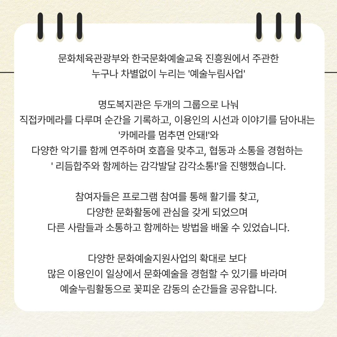 예술누림활동으로 꽃피운 감동의 순간들을 공유합니다.