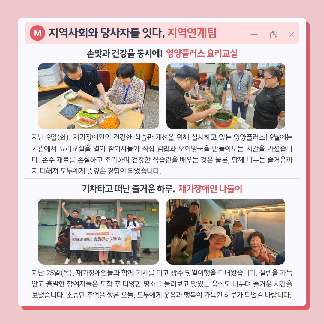 햇살은 한결 부드럽고 바람은 상쾌해지는 계절, 명도복지관의 9월 이야기를 함께 나누며 행복한 시간을 보내시길 바랍니다.