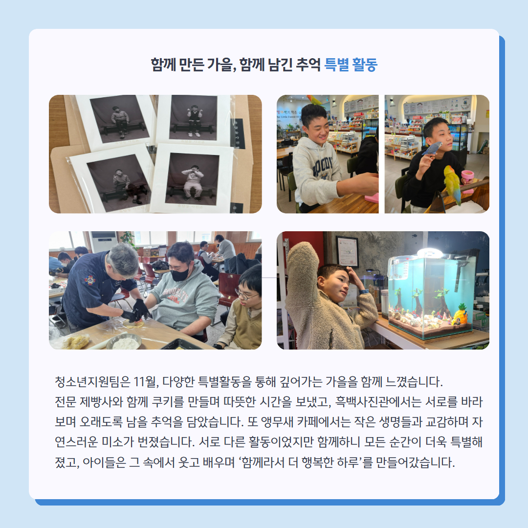 한층 차가운 바람 속에서도 햇살이 따뜻하게 머무는 11월, 한 해의 마지막을 준비하는 마음이 조용히 깊어지는 시기입니다. 일상 곳곳에서 느껴지는 작은 온기처럼, 여러분의 관심과 응원이 늘 큰 힘이 되어 서로에게 따뜻한 동행이 되고 있습니다. 함께해주신 마음에 진심으로 감사드리며, 문득 찾아오는 계절의 여유가 여러분의 하루에도 포근한 위로와 기쁨이 되길 바랍니다. 늘 건강하시고, 올 한 해의 끝자락까지 평안과 행복이 가득하시기를 바랍니다.